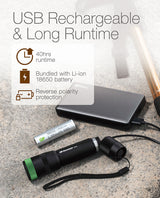 Powered by a 18650 lithium-ion battery, the CR42 is rechargeable and offers hours run-time in the lowest output.